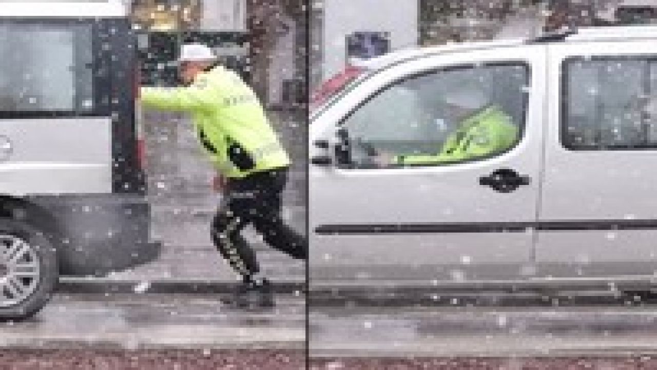 Çorum’un Gazi Caddesi'nde trafik polisleri, kar yağışının etkisiyle arıza yapan bir hafif ticari araç sürücüsüne yardım etti. Bir polis memuru aracı kullanırken, diğeri aracı itekleyerek güvenli bir alana çekilmesini sağladı. Bu yardım anı, bir cep telefonu kamerasıyla kaydedildi.