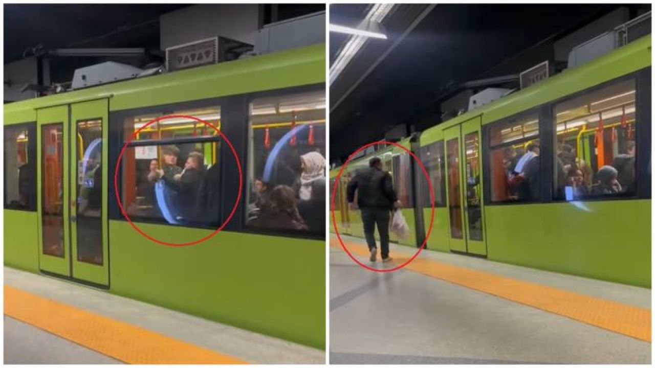 Görüntülerde, metronun içinde darbedilen yolcunun, vagonun kapıları açıldığında, diğer yolcular tarafından tekmelenerek dışarı atıldığı, elindeki poşetlerin de yere düştüğü görüldü.