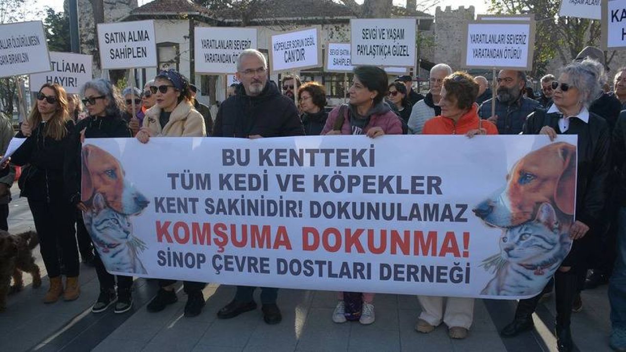Sinop’ta Çevre Dostları Derneği öncülüğünde bir araya gelen hayvanseverler, sokak köpeklerinin toplanmasına karşı Uğur Mumcu Meydanı’nda “Katliama Hayır!” sloganıyla basın açıklaması düzenledi. “Yaratılanı Severiz Yaratandan Ötürü” ve “Köpekler Sorun Değil Candır” dövizleri taşıyan katılımcılar, mevcut uygulamalara ve yasal düzenlemelere tepki gösterdi.