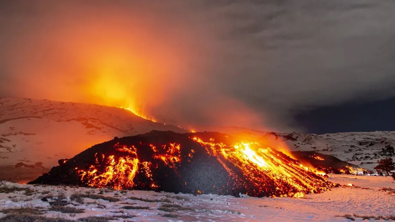 Etna Yanardağı, İtalya'da günlerdir lav ve kül püskürtmeyi sürdürüyor. Lavlar, kar ve buzla buluşarak eşsiz manzaralar oluşturuyor. Yanardağın faaliyetleri sonucunda bölgede büyüklüğü 3.7'yi bulan depremler meydana geliyor.
